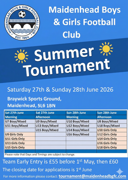 Our sponsors: The 2026 Maidenhead Boys and Girls Tournament is on! Our annual Tournament is running on the weekend 27th & 28th June 2026 at Braywick Sports Ground, Braywick Road, Maidenhead, SL6 1BN. See reference for the games below: Pitch Plan Tournament Rules (click to download) Tournament Invitation (click to download) Following the format of previous years: U9s to U18s will play 6-aside starting on a league basis followed by a quarter final knockout tournament (where the number of entries allows) U7s and U8s will play a round robin friendly event at 5-aside with all participants in these age groups will receive an award Run by Volunteers! For the tournament to be successful we will need volunteers to help in the run up and over the weekend itself.